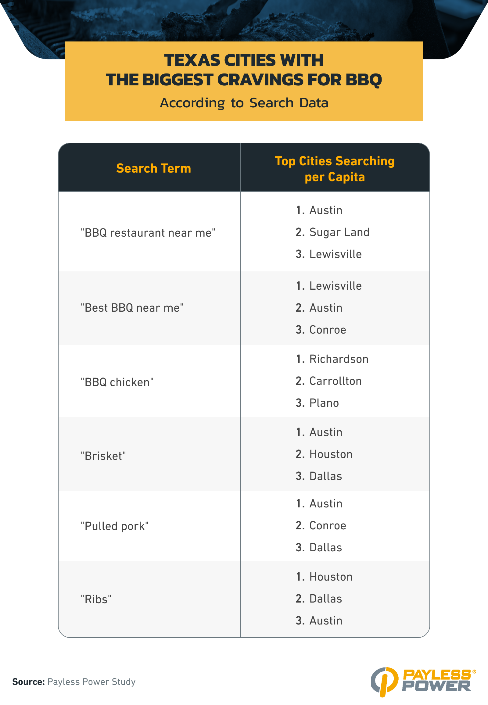 - Austin often ranks among the top 3 cities searching for BBQ-related terms, hitting No. 1 for “BBQ restaurant near me,” “brisket,” and “pulled pork.”