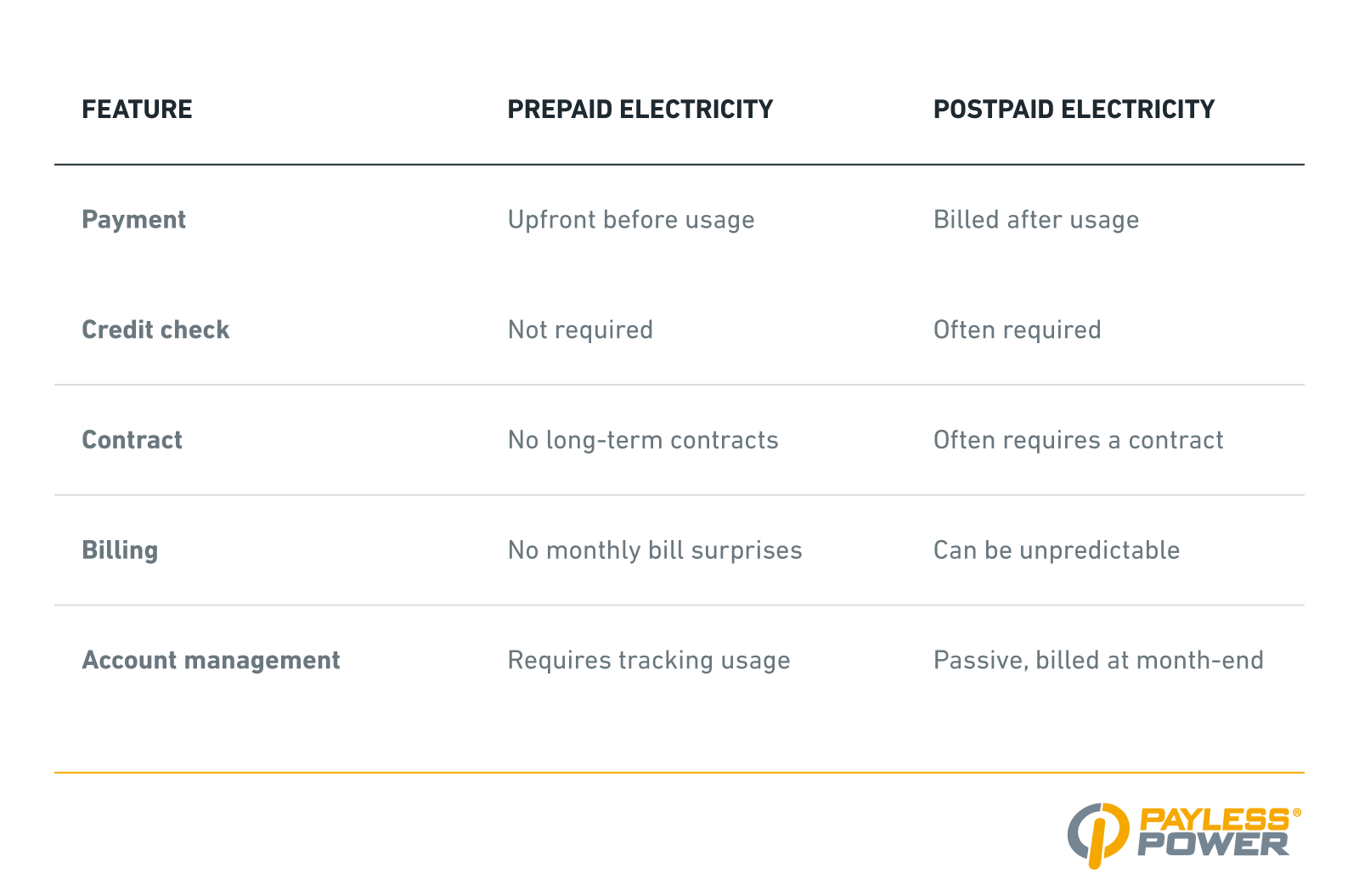 - Prepaid and postpaid electricity plans offer different approaches to managing energy costs, each with its own advantages and trade-offs. The table below outlines the main distinctions between prepaid and postpaid electricity.